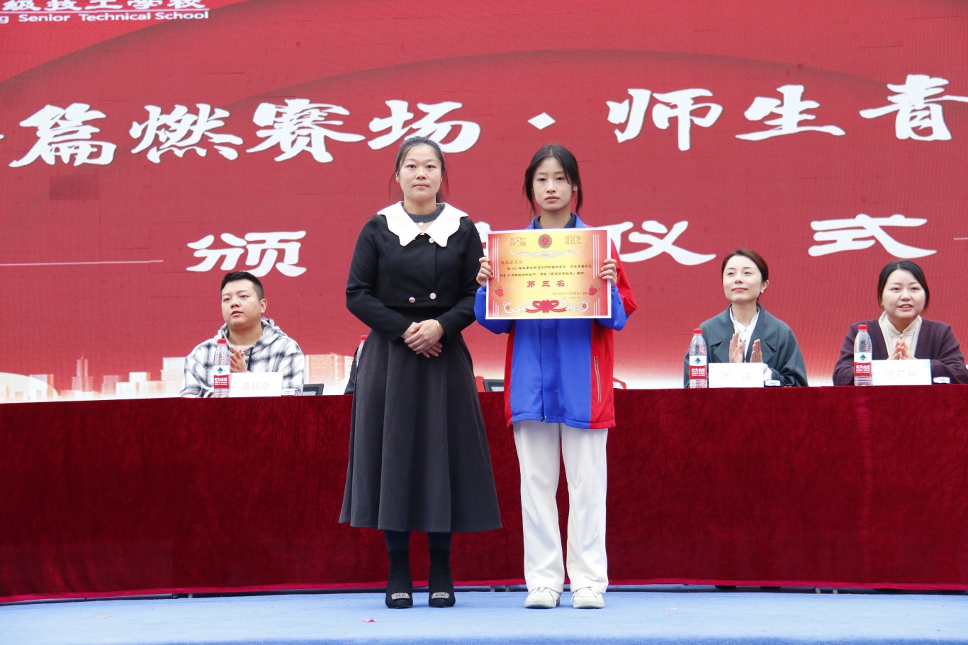 回顾运动会,无数精彩瞬间依旧在心间激荡。跑道上,是速度与耐力的角逐;田赛场中,是爆发与投掷的比拼;拔河绳间,是个人风采与团队伟力的交融;观众席上,是此起彼伏、响彻云霄的呐喊。这一切,共同谱写了一曲荡气回肠的青春交响诗。 我们记得你冲刺的英姿,更记得他们陪你奔跑的身影;我们记得金牌的荣耀,更记得声嘶力竭的加油呐喊。比成绩更珍贵的,是终点处及时的搀扶;比阳光更炽热的,是赛道旁与你同频的心跳。 我校副校长、茶园校区校长张洁致闭幕辞。她首先向获奖集体与个人致以热烈祝贺,并向全体裁判员、志愿者及工作人员表示诚挚感谢。张校长高度赞扬了本届运动会展现的昂扬风貌,并强调:赛事终有期,精神永流传。希望同学们将赛场的豪情化为求知的动力,将团队的默契化为成长的基石,让青春在更广阔的天地里续写辉煌! 盛会虽落幕,青春不散场。在经久不息的热烈掌声中,我校2025年秋季“技师新篇燃赛场·师生青春共飞扬”田径运动会圆满落下帷幕。愿这份荣光与感动,汇聚为前行的力量,照亮我们奔赴下一场山海!